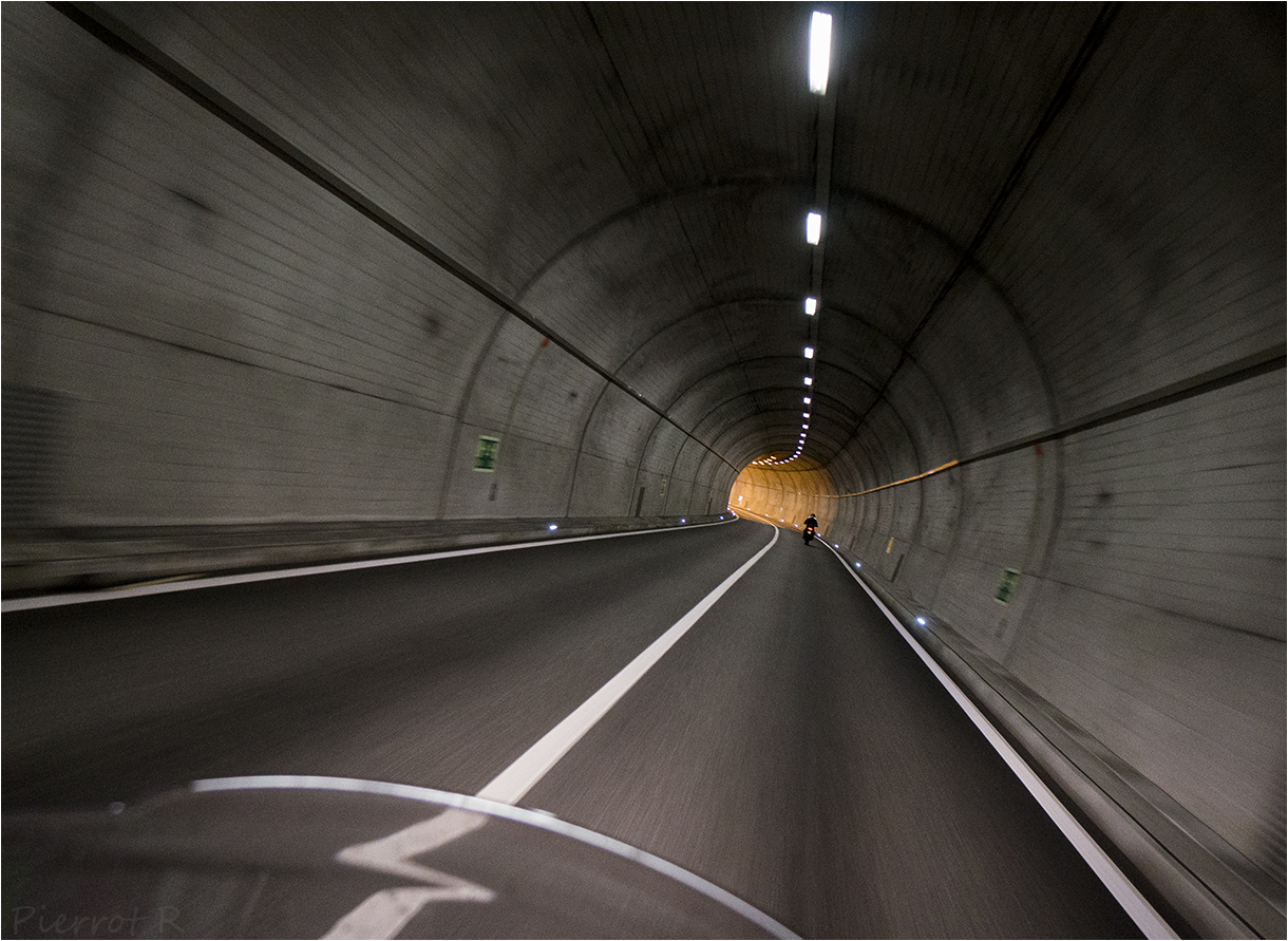 Dans un tunnel en Suisse en moto avec un pote.