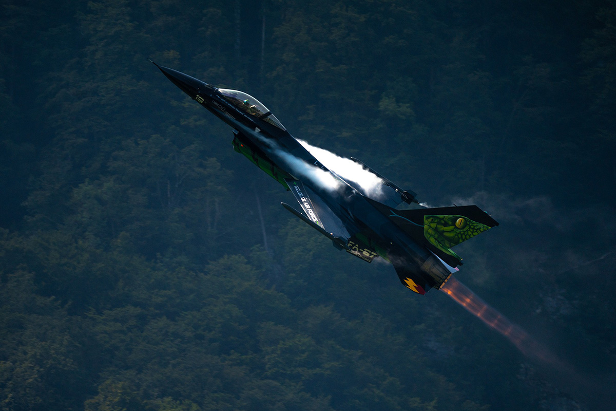 F/A-18 Hornet de l'armée Suisse lachant des leurres anti-missiles.